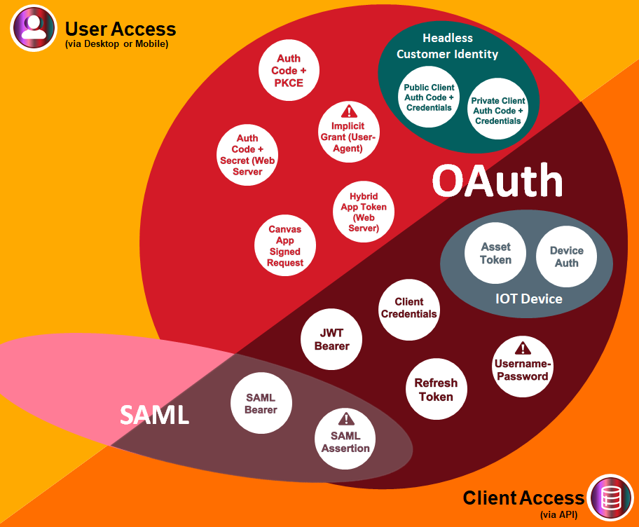 - Server Access OAuth Flows - Covers flows which are most often used in server-to-server authentication which can be carried out without real time user interaction. These are the OAuth flows in the "Client Access" section of the diagram other than the IOT Device flows.